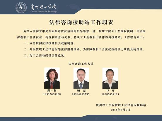 best365英国在线体育官网教职工法律咨询援助站是由校工会和马列主义教学部共同发起成立的公益性法律咨询援助组织,主要成员为学校具有法律资质、法律专业背景的教师,主要服务对象为学校教职工。马列主义教学部负责援助站日常管理工作,将通过面对面、电话来访、网络在线解答等多种方式,为广大教职工提供法律咨询、法案调解等力所能及的法律服务;通过普法宣传来提升教职工法律意识;针对经济困难或者遇到特殊案件的教职工提供法律援助。