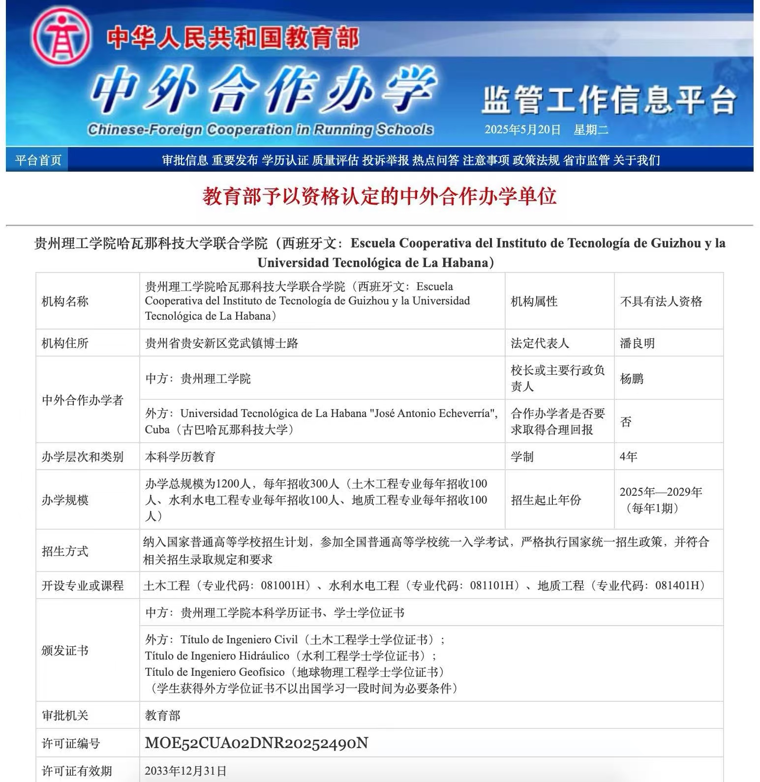 近日,教育部中外合作办学监管工作信息平台传来重磅喜讯:best365英国在线体育官网与古巴哈瓦那科技大学合作设立的best365英国在线体育官网哈瓦那科技大学联合学院正式通过教育部资格认定,成为学校首个获教育部批准成立的中外合作办学机构,是中拉首批工程类合作办学机构,也是全国为数不多用西班牙语授课的工程类中外合作办学机构,为中拉文明互鉴与科技教育融合开辟了全新路径。