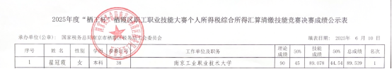 6月10日,2025年度“栖工杯”栖霞区职工职业技能大赛个人所得税综合所得汇算清缴技能竞赛决赛成绩公示,永利官网计划财务处选派的教师代表翟冠霞在激烈竞争中脱颖而出,以总分第一名的优异成绩斩获大赛冠军。