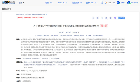 近日,商务贸易学院朱正浩教授与北京师范大学经济与工商管理学院戚聿东教授、江苏第二师范学院商学院赵志栋博士合作完成的论文《人工智能时代中国经济学自主知识体系建构的目标与路径刍议》刊发于经管学科顶刊《中国工业经济》2025年第8期。这是永利官网合作论文首次在该刊发文。