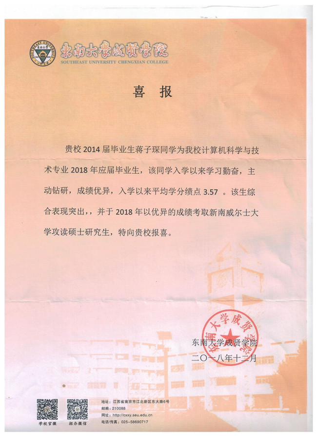 日前,永利官网接到东南大学成贤学院喜报,喜报称:永利官网2014届毕业生蒋子琛考入东南大学成贤学院,蒋子琛同学进入东南大学成贤学院后学习勤奋,主动钻研,成绩优异,平均学分绩点3.57,综合表现突出。2018年以优异的成绩考取新南威尔士大学攻读硕士研究生(该大学为澳大利亚世界顶尖级研究型学府,澳大利亚名校联盟“八大名校”之一,在最新的“QS世界大学排名(2017-2018)”中,新南威尔士大学位居世界第45位)。