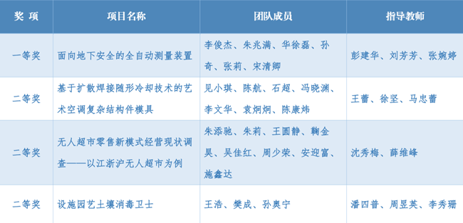 “挑战杯”全国大学生课外学术科技作品竞赛是共青团重点打造的一项赛事,由共青团中央、中国科协、教育部、全国学联和地方政府共同主办。是一项具有导向性、示范性和群众性的全国竞赛活动,是当代大学生科技创新领域中的权威赛事,被誉为当代大学生科技创新的“奥林匹克”盛会。从1989年19所高校发起首届“挑战杯”、300多人的小剧场,发展到现在全国1200多所高校参与、200多万大学生同台竞技的大舞台,“挑战杯”已经成为青年学生展示创意思维、汇聚创新成果、实现创业梦想的科技盛会。永利官网4项作品:计算机与软件学院的《面向地下安全的全自动测量装置》(团队成员:李俊杰、朱兆满、华徐磊、孙奇、张莉、宋清卿,指导教师:彭建华、刘芳芳、张婉婷),机械工程学院的《基于扩散焊接随形冷却技术的艺术空调复杂结构件模具》(团队成员:见小琪、陈航、石超、冯晓渊、李文华、袁炯炯、陈康炜,指导教师:王蕾、徐坚、马忠蕾),经济管理学院的《无人超市零售新模式经营现状调查——以江浙沪无人超市为例》(团队成员:朱添驰、朱莉、王圆静、鞠金昊、吴佳红、周少荣、安迎富、施鑫达,指导教师:沈秀梅、薛维峰),交通工程学院的《设施园艺土壤消毒卫士》(团队成员:王浩、樊成、孙奥宁,指导教师:潘四普、周昱英、李秀珊)成功入围并取得优异成绩。