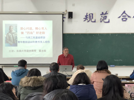 2月27日,公共基础课部特邀东南大学退休教师董本植教授给全体老师举办“潜心问道,精心育人,做‘四有’好老师”讲座,开展师德师风教育活动。享受国务院特殊津贴、现年85岁的董老师语重心长地与老师们分享了自己从教60年的感悟,一是要热爱教师工作,二是要精心静心教书育人。他将自己60年的教师生涯凝结为一个关键词——“热爱”。他回忆了自己如何与教育结缘,如何兢兢业业奋战在教育战线,如何在退休后、即使在80岁高龄、仍然继续发光发热、坚守在教学一线、不遗余力“塑造学生”、为党和国家培养合格的建设者与接班人等一系列经历,老师们聆听后非常感动,对教育事业又有了更深层次的认识与理解。董老师还介绍自己如何紧跟时代、关心时政、及时更新和精心设计教学内容、以及在七八十高龄的时候、在零基础的状态下学习做PPT课件、学习运用多媒体手段增强教学效果,他还介绍自己如何在课上以情动人感染学生,如何在课后走近学生、与生交友、帮助学生。在董老师朴实的语言里,老师们感受到了他热爱生活、热爱教育、热爱学生的情怀,以及他生命不息、授业不止、三尺讲台、不懈耕耘的宝贵精神,深受启发和教育。
