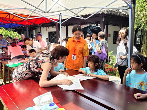 活动当天,熙南里街区里20余名非遗传承人摆出展台,向市民游客展示各自的拿手绝活,计算机与软件学院的志愿者们协助非遗传承人指导感兴趣的小朋友自己动手制作面塑、核雕、布贴画等非遗作品,作为“户外手工课”的礼物带回家。南京市民俗馆还结合端午节俗文化设置了非遗体验区,通过带来的五彩吉缯(端午彩粽)、面塑(小猪佩奇吃粽子)、拓印(端午龙舟)、布贴画(二十四节气画及端午节)4堂“非遗体验课”,让观众在体验过程中领略非物质文化遗产中的节俗文化内涵。甘家大院南门花园草坪的舞台上,由甘家大院民乐团的成员演出的江南丝竹,丝丝入扣、激情有活力;南京市拉撒路小学的同学参加“500娃娃学非遗”活动证书的颁发仪式,让更多的人明白保护文化遗产要从娃娃做起;金陵风白局曲艺团表演的节目“南京白局”声情并茂、浩荡淋漓;以及茶文化、由建邺空竹协会团队带来 的化石空竹表演,都是非遗保护的实力验证。