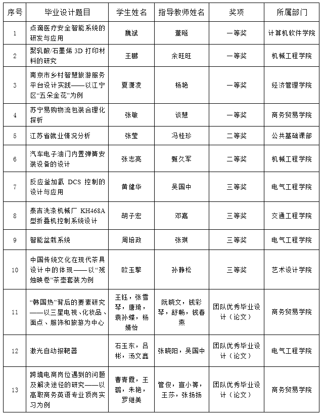 近期获悉,根据《省教育厅办公室关于做好2016年普通高校本专科毕业设计(论文)评优与抽检工作的通知》(苏教办高〔2016〕7号)要求,学校创新毕业设计省级推优办法,在学校推荐的基础上,经专家评审、结果公示和省教育厅审定等程序,永利官网所推荐参加普通高校本专科毕业设计(论文)省级评选的十三篇论文(个人申报10项,团体申报3项),获得个人一等奖4项,二等奖2项,三等奖4项,团体奖三项,获奖率100%,成为一等奖获奖量和获奖总数最多的高职院校,名列全省首位,创学校历史新高。