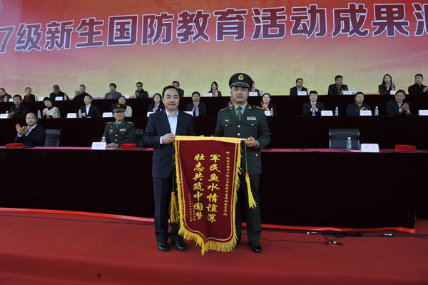 国防教育成果汇报大会上,党委书记吴学敏代表学校向解放军陆军工程大学指挥军官基础教育学院贾卫主任赠送了“军民鱼水情意深,壮志共筑中国梦”的锦旗,感谢解放军陆军工程大学指挥军官基础教育学院对永利官网的大力支持。党委委员、副校长苏小冬宣读了军训先进集体和个人的表彰决定。学校领导和嘉宾为获奖的“军训先进连队”、“优秀教官”、“优秀教导员”等集体和个人代表颁奖。
