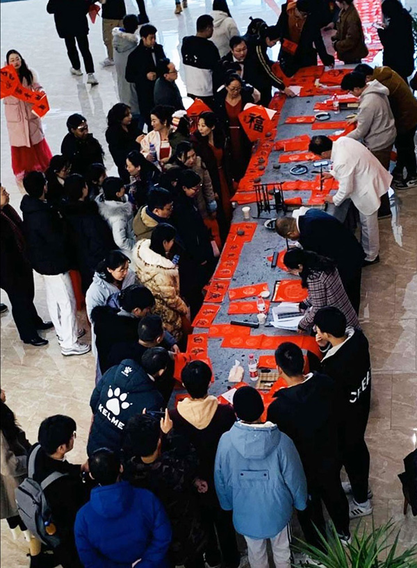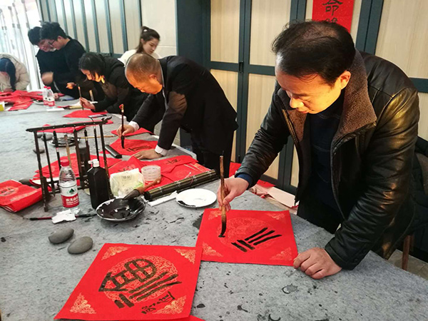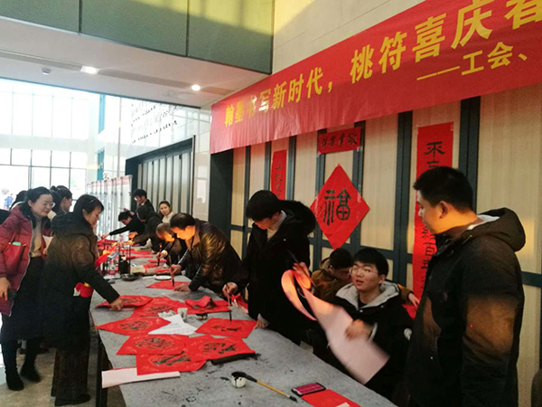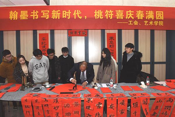 值此2020新年到来之际。南工院举行了辞旧迎新大联欢。工会,艺术设计学院,校书法协会联合举办了以“翰墨书写新时代,桃符喜庆春满园”为主题的送春联送福字活动。活动启动仪式由(全国)教育书画协会高等书法教育分会理事、校党委委员、纪委书记于林惠教授提笔书写“福字”开始,接着由(全国)教育书画协会高等书法教育分会会员、书法协会指导老师刘圣进书写自撰对联:不忘初心历经百年迈进新时代,牢记使命双手万能创造大未来。然后广大师生一起挥毫,数千师生积极参与。近年来,永利官网书法艺术在三全育人,立德树人,增进学校文化氛围,提升师生文化自信等方面做了一些尝试,为学校文化育人作出了积极的贡献。通过这次活动,锻炼了书法协会同学们的动手能力,加强了广大师生员工的情感交流,也表达了书法协会新年深情的祝福:祝福祖国繁荣昌盛、人民幸福安康!祝福学校蒸蒸日上,又上新台阶!祝福全校师生新年快乐,万事顺意!