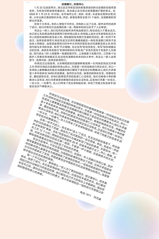 受新冠肺炎疫情影响,学生在学习、生活、情感等方面受到不同程度的挫折与挑战,为了提高大学生的心理素质,培养热爱生活乐观向上的精神,航空工程学院结合学生实情于3月11日发起“逆境携行,你我同心”为主题的美文征集活动。