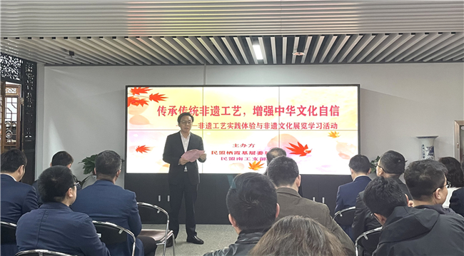 王汝成对学校给予民盟以及非遗传承的大力支持表示感谢。王汝成表示,民盟南工支部工作开展有力、有序、有活力。非物质文化遗产的世代传承记载了一代代中国人民对美好生活的向往。他强调,要对非遗工艺进行活态传承与创新。民盟成员主要由从事文化教育以及科学技术工作的中、高级知识分子组成,传承保护非遗文化是民盟义不容辞的一项工作。