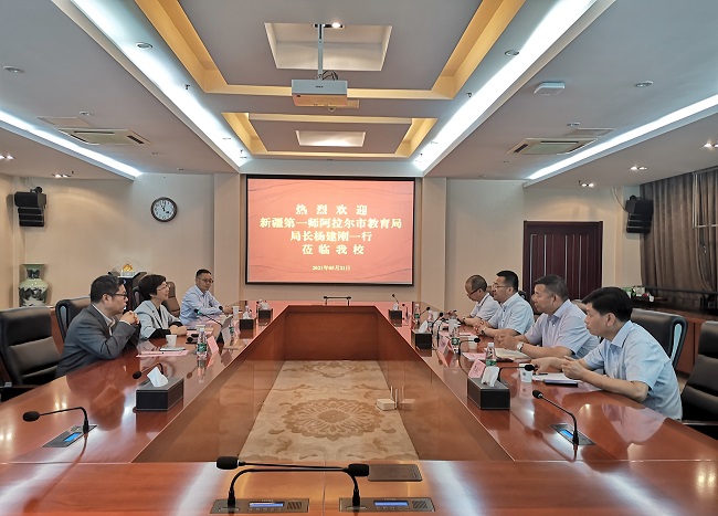 5月21日上午,新疆第一师阿拉尔市教育局局长杨建刚一行来永利官网考察调研。党委常委、副校长苏小冬,以及校长办公室、教务处、科技处、发展合作处等部门负责同志在行政楼辅楼一楼会议室接待了来宾。