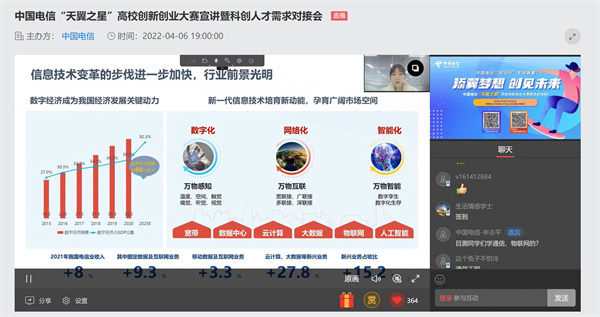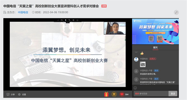 为了贯彻落实国家发展和改革委员会、教育部、人力资源和社会保障部等部门联合印发的《关于深入实施创业带动就业示范行动力促高校毕业生创业就业的通知》(发改办高技〔2022〕187号)文件精神,做实双创示范基地结对共建,4月6日,yl23411永利集团官网与中国电信集团有限公司联合举办“天翼之星”高校创新创业大赛线上宣讲暨科创人才需求对接会。学校创新创业学院相关负责人以及近300名师生代表参加了线上会议。