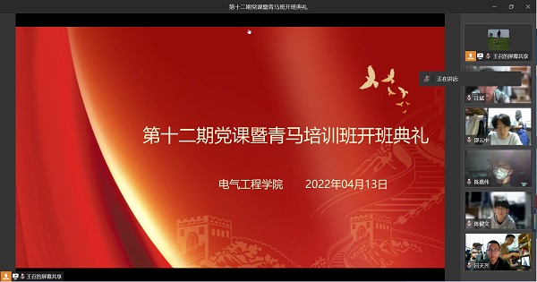 4月13日,电气工程学院第十二期党课暨青马培训班开班典礼在企业微信线上举行。学院党委委员、各党支部书记、团总支书记以及80名学员共同参加了此次开班典礼。