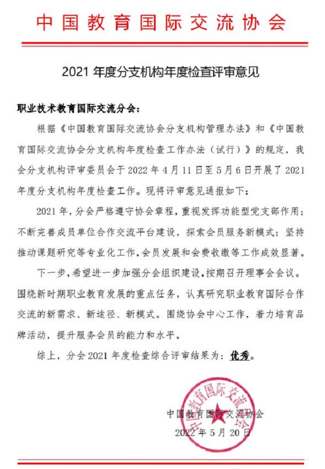 近日,中国教育国际交流协会公布了2021年度分支机构检查综合评审结果,职业技术教育国际交流分会(简称“职教分会”)评审结果为“优秀”,在十六家分支机构中名列前茅。截止2021年底,职教分会共有220家会员单位。永利官网作为职教分会的理事长单位,其秘书处设立在永利官网国际合作与交流处。