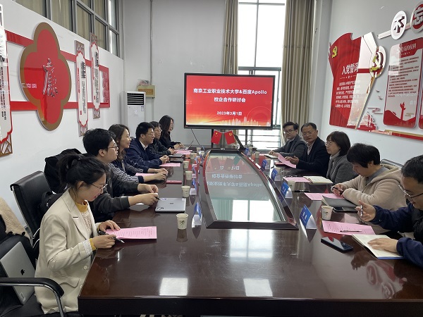 王文凯对来访嘉宾表示热烈欢迎,介绍了学院的发展沿革及专业建设情况。张亮对百度智能驾驶事业群和无人驾驶事业部的分工及架构做了介绍。周昱英介绍了学院与百度合作进程及建设成果,表示学院与百度在专业建设、人才培养等多项领域存在合作契合点并进行了相应讨论。双方在实验室设备应用、后续业务支持和改进方面进行了详细沟通,同时就自动驾驶系列教材开发、资源库建设、课程开发、课程标准建设、联合人才培养等未来可能合作领域做了进一步探讨。