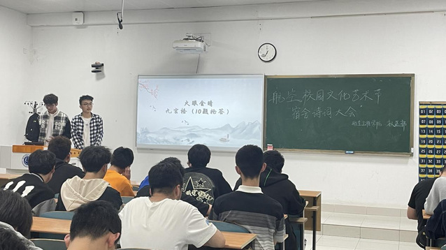 为贯彻落实习近平总书记关于弘扬中华优秀传统文化的指示精神,激发同学们对诗词的热情,2023年4月27日,航空工程学院学生会权益部在乐群楼205教室举办了宿舍中华诗词大会。本次活动以宿舍为单位报名参赛,旨在使同学们通过比赛领会中华诗词文化精髓,传承和弘扬社会主义核心价值观。