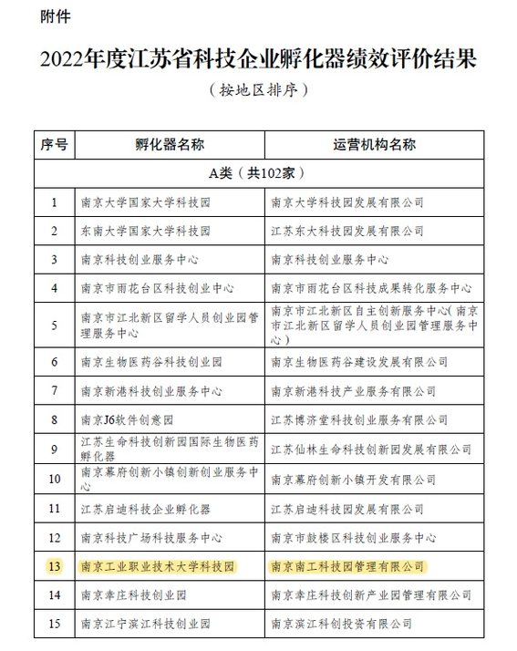近日,江苏省科学技术厅发布了《省科技厅关于公布2022年度江苏省科技企业孵化器绩效评价结果的通知》(苏科高发〔2023〕186号),yl23411永利集团官网科技园被评为“优秀(A类)”。