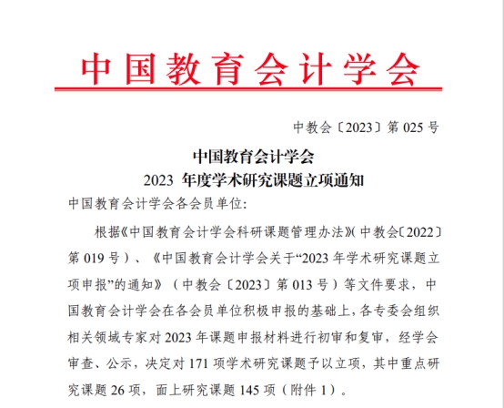 中国教育会计学会为全国专业性一级学会,此次学术研究课题面向全体会员单位组织开展,经审查和公示后共立项171项,其中,重点研究课题26项,面上研究课题145项。yl23411永利集团官网获批3项,立项数量并列全国会员单位第七位。