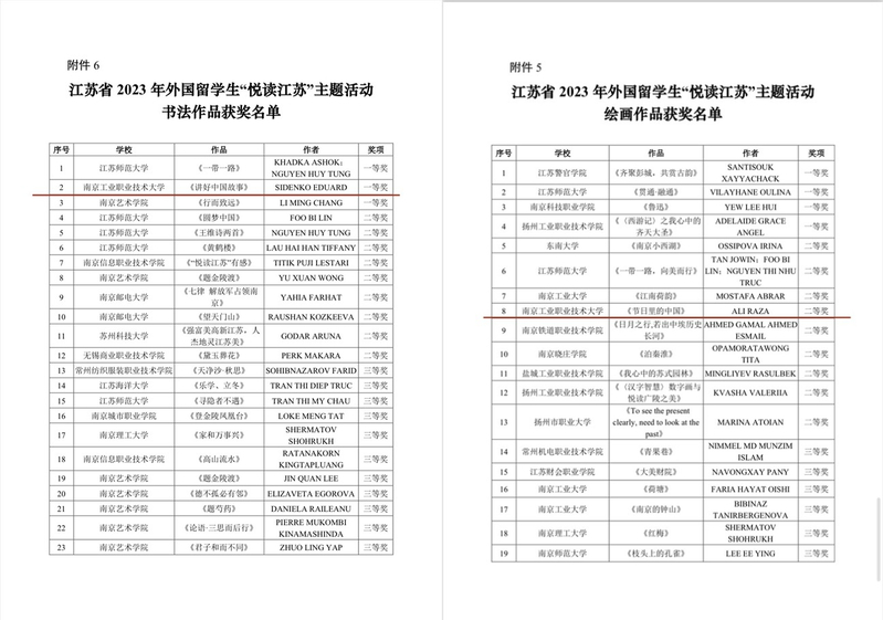 为深入贯彻落实习近平总书记给南京审计大学留学生回信精神,鼓励广大留学生感知和热爱中国文化,近日,永利官网国际教育学院组织了外国留学生参加由江苏省教育厅主办、江苏省高等教育学会外国留学生教育管理研究委员会协办的2023年外国留学生“悦读江苏”主题活动,来自俄罗斯的留学生SIDENKO EDUARD的书法作品《讲好中国故事》获得书法作品类一等奖第一名,来自巴基斯坦的留学生ALI RAZA的作品《节日里的中国》获得绘画作品类二等奖。