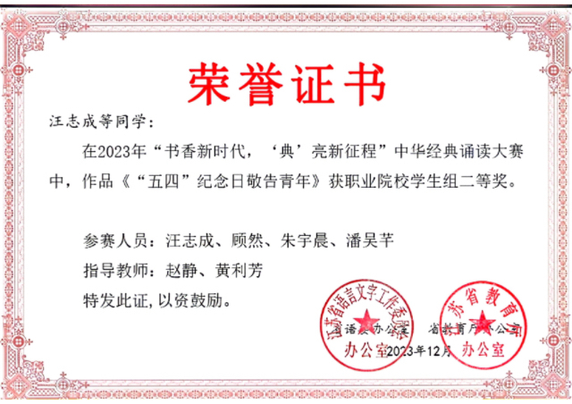为诠释中华优秀文化内涵、彰显中华语言文化魅力,提升社会大众特别是广大青少年的语言文字应用能力和语言文化素养,激发对中华经典的热爱,营造爱读书、读好书、善读书的良好氛围,助力建设全民终身学习的学习型社会、学习型大国,省教育厅、省文明办、省文旅厅、省新闻出版局、省全民阅读办等五部门组织开展了2023年“书香新时代,‘典’亮新征程”中华经典诵读大赛。经基层推荐、网络投票及省级评审,永利官网公共基础课部黄利芳、赵静老师指导的学生作品《“五四”纪念日敬告青年》获职业院校学生组二等奖。