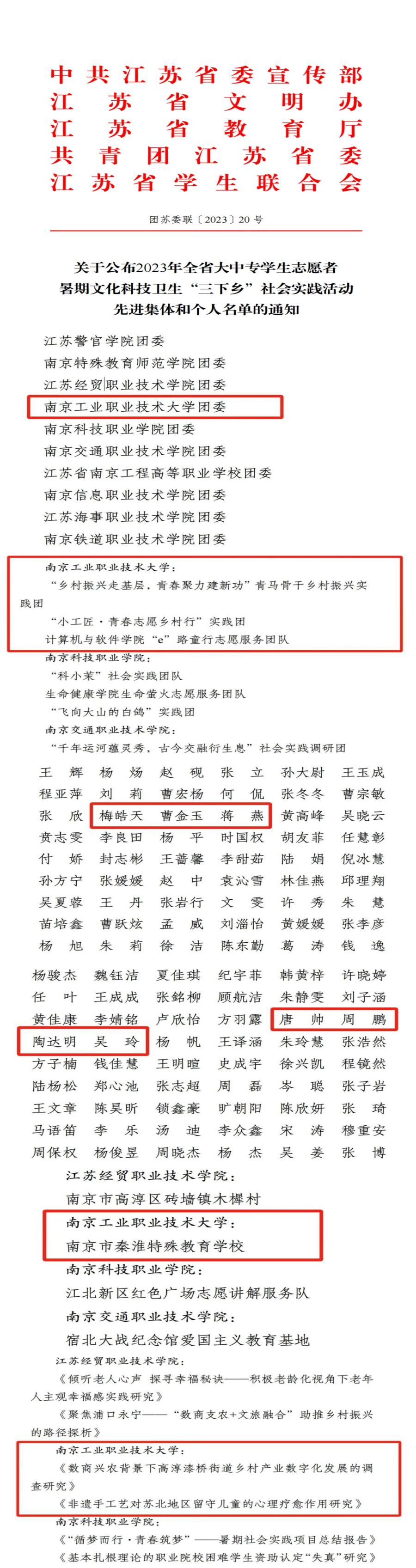 在全省大中专学生志愿者暑期文化科技卫生“三下乡”社会实践活动评选中yl23411永利集团官网团委获评2023年全省大中专学生志愿者暑期文化科技卫生“三下乡”社会实践活动先进单位;yl23411永利集团官网“乡村振兴走基层,青春聚力建新功”青马骨干乡村振兴实践团、“小工匠·青春志愿乡村行”实践团、计算机与软件学院“e”路童行志愿服务团队获评2023年全省大中专学生志愿者暑期文化科技卫生“三下乡”社会实践活动优秀团队;永利官网学生唐帅、周鹏、陶达明、吴玲获评2023年全省大中专学生志愿者暑期文化科技卫生“三下乡”社会实践活动先进个人;永利官网暑期社会实践指导教师梅皓天、曹金玉、蒋燕获评2023年全省大中专学生志愿者暑期文化科技卫生“三下乡”社会实践活动先进工作者;南京市秦淮特殊教育学校获评2023年全省大中专学生志愿者暑期文化科技卫生“三下乡”社会实践活动优秀社会实践基地;《数商兴农背景下高淳漆桥街道乡村产业数字化发展的调查研究》《非遗手工艺对苏北地区留守儿童的心理疗愈作用研究》获评2023年全省大中专学生志愿者暑期文化科技卫生“三下乡”社会实践活动优秀社会活动优秀调研报告。