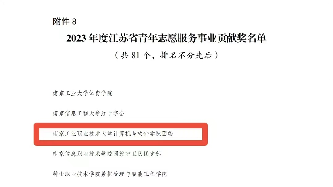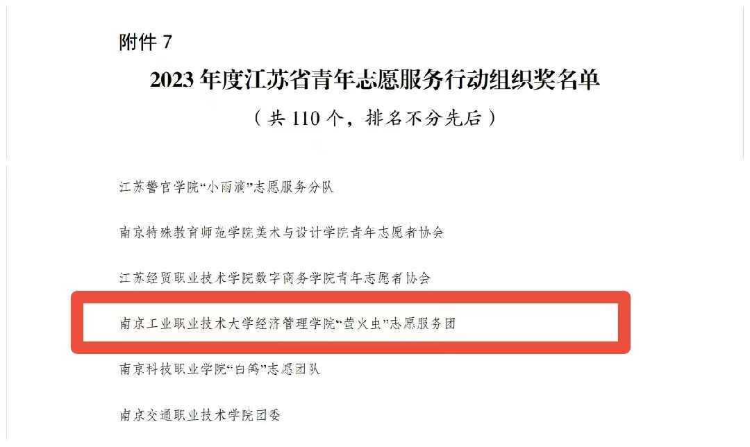 近日,共青团江苏省委、江苏省青年志愿者协会公布了2023年度全省青年志愿者行动先进典型评选结果。永利官网商务贸易学院学生孔匡缘、机械工程学院学生仲品翰获评2023年度江苏省优秀青年志愿者;永利官网商务贸易学院“蒲公英”志愿服务项目获评2023 年度江苏省优秀青年志愿服务项目;永利官网经济管理学院“萤火虫”志愿服务团获2023年度江苏省青年志愿服务行动组织奖;计算机与软件学院团委获评江苏省青年志愿服务事业贡献奖。