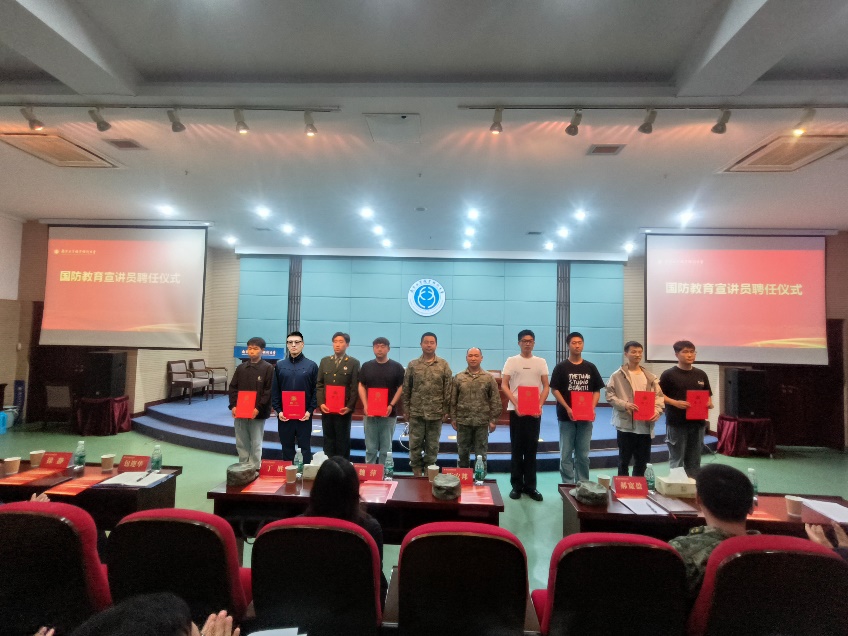 为抓好国防教育“最后一公里”,增强朋辈引领,永利官网人武部通过学院推荐与个人自荐的方式选拔了24名同学,组成国防教育宣讲团,深入学生社区、走进班团,常态化开展国防教育,普及征兵政策,协助学院开展国防教育活动,让更多同学厚植家国情怀,了解并参与到国防教育活动中。丁胜、陈安邦为受聘宣讲员代表颁发聘书。