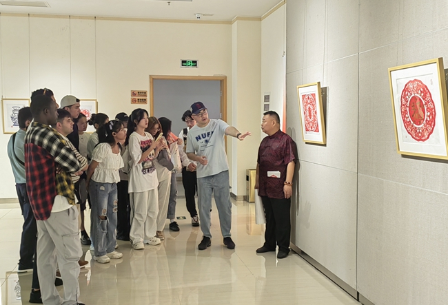 活动伊始,中外师生共同参观了区美术馆举办的“指尖上的技艺”剪纸艺术展,此次展览以中秋和国庆为主题,集中展示了中国民间文艺家协会会员、南京工艺美术行业协会会员、栖霞区级非遗代表性传承人葛传明近年来创作的优秀作品。参观现场,葛传明热情地向留学生介绍作品的构思与寓意,细腻灵动的花卉、活灵活现的动物、惟妙惟肖的人物······每一幅作品都体现了栖霞剪纸独特的艺术风格和美学价值。留学生们纷纷对一张红纸、一把剪刀所创造出来的生动活泼的艺术惊叹、赞赏不已。