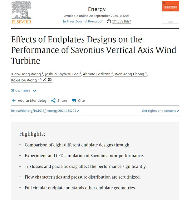 近期,永利官网艺术设计学院产品设计系王晓航副教授作为第一作者,以yl23411永利集团官网为第一完成单位,在国际能源工程领域顶刊《Energy》发表题为“Effects of Endplate Designs on the Performance of Savonius Vertical Axis Wind Turbine(端板设计对Savonius垂直轴风力机性能的影响)”的研究论文,由Elsevier出版。《Energy》期刊为中科院、JCR双一区Top期刊,2023年影响因子9.0。