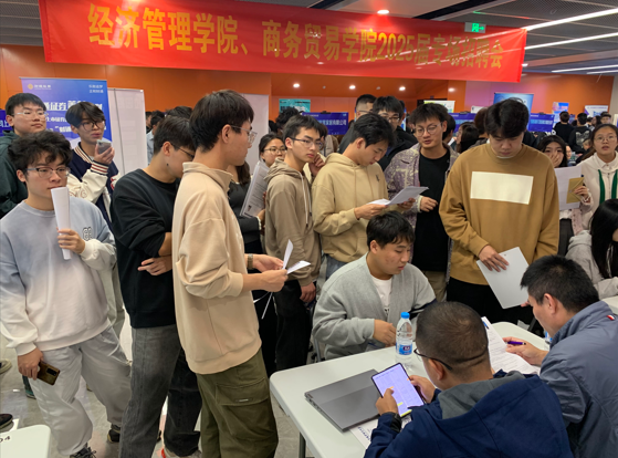 为了搭建毕业生与用人单位之间的双向选择平台,11月13日下午,经济管理学院与商务贸易学院在学校双创大楼A栋一楼大厅联合举办2025届毕业生专场招聘会。本次招聘会吸引了来自金融证券、文化传媒、电子商务等多个领域的50余家知名企业参会,提供了近600个就业岗位。
