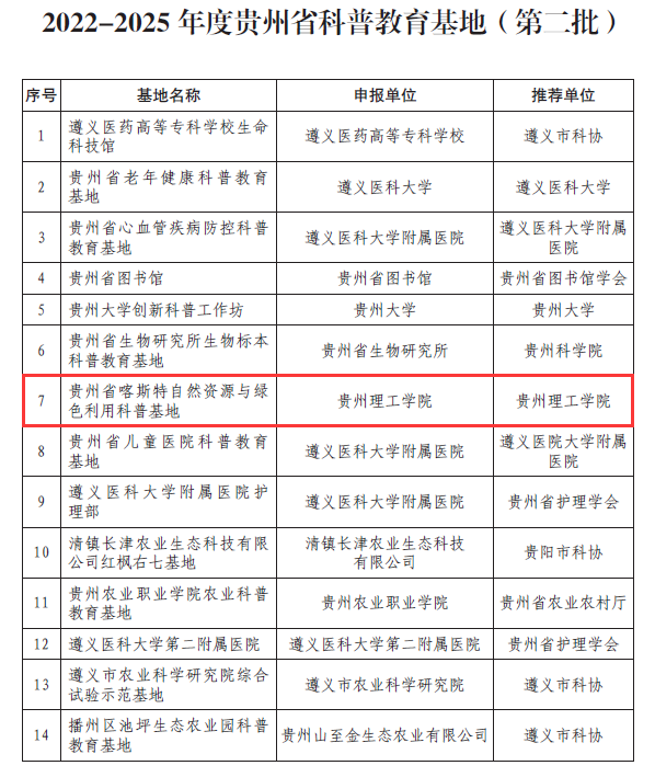 日前,在贵州省科学技术协会主办的贵州省科普教育基地联盟成立大会上对获得2022—2025年度贵州省科普教育基地的42家单位进行了授牌,best365英国在线体育官网组织申报的“贵州省喀斯特自然资源与绿色利用科普基地”名列其中。该科普基地由学校科技处指导,资源与环境工程学院牵头,联合矿业工程学院、材料与能源工程学院(贵州省轻金属材料制备技术重点实验室)、化学工程学院、航空航天工程学院、创新创业中心等多部门联合申报。