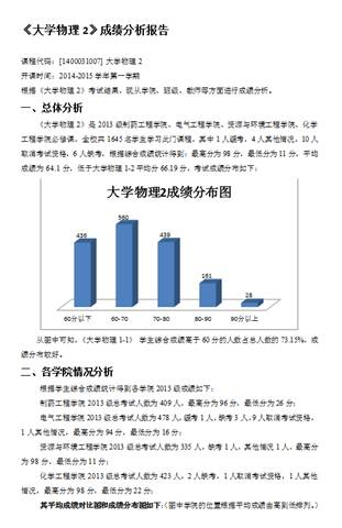 成绩质量分析报告主要从总体、学院、班级、教师四个层次对每门必修课做了分析、对比,客观的反应了各学院、班级成绩的变化,对各学院教学工作安排提供参考。本次分析报告的数据来源于教务处提供的各公共必修课、专业必修课的成绩表以及招就处提供的2014级学生高考成绩。